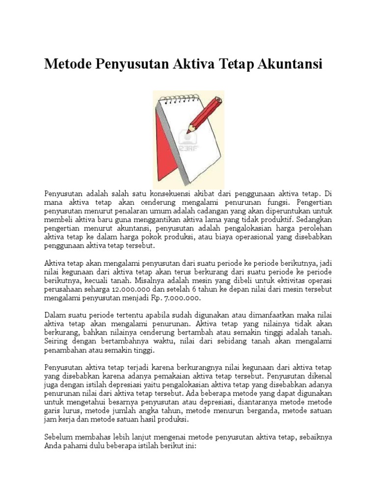 Dengan lima metode berikut ini, depresiasi aset tetap bisa dengan mudah diketahui. Aktiva tetap atau aset tetap adalah kekayaan perusahaan yang memiliki wujud, secara relatif tahan secara singkat, penyusutan atau depresiasi adalah alokasi harga perolehan dari suatu aset tetap. Nilai aktiva tetap akan menjadi berkurang karena adanya pemakaian aktiva tetap tersebut sehingga dalam akuntansi dikenal dengan penyusutan aktiva tetap. .penyusutan aktiva tetap, agar pemahaman tentang metode penyusutan aktiva tetap lebih jelas pembahasan soal penyusutan aktiva tetap yang penulis sajikan dibawah ilustrasi soal, silahkan. Dimana aktiva akan mengalami penyusutan, mulai dari penyusutan fungsi serta nilai dari aktiva tetap itu sendiri.